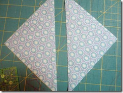 Line up the diagonal on a square ruler with the seam line. Trim to 4 inches square.